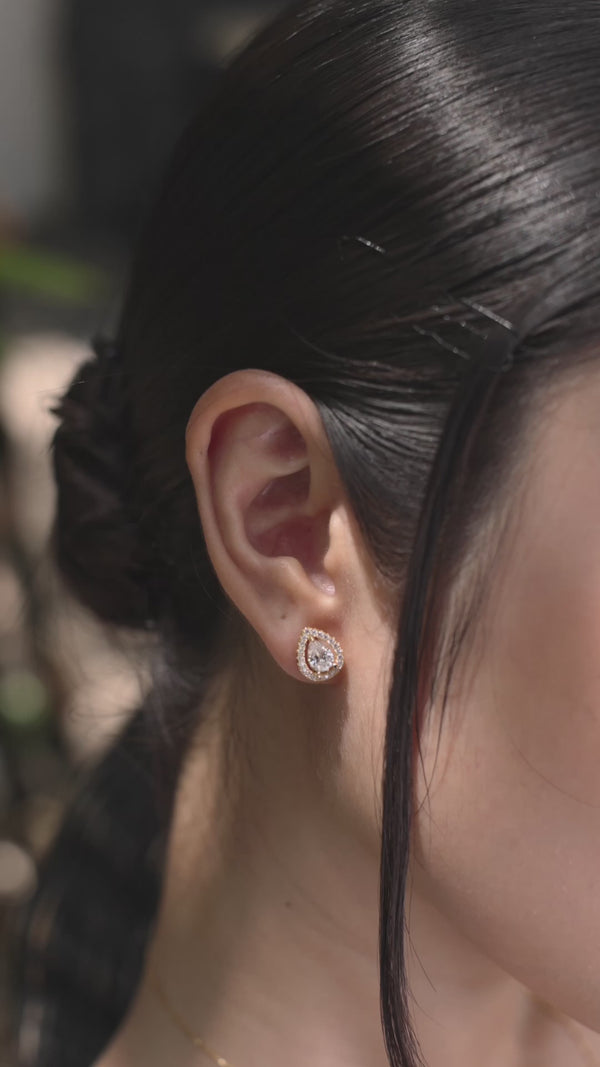 This design is a smaller version of our bigger Emile Studs and is more understated. These cute studs feature an exquisite border setting and pear-cut centre stone.