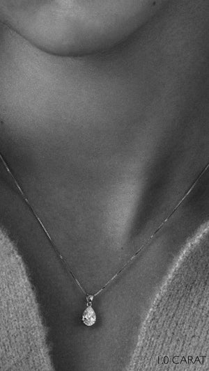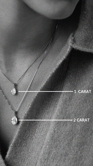 This solitaire pear pendant necklace is more unique than a simple round stone. One key to cutting a good pear shape is eliminating the bow-tie effect that appears in the lower midsection of the stone.