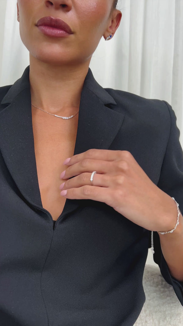 This delicate adjustable pendant necklace, crafted in sterling silver and finished in white gold, is embellished with marquise-cut stones and micro-set details.