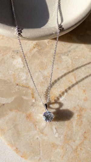 This stunning and simplistic four-prong pendant necklace has a feminine twist. This classic pendant is set in 9K White Gold with a round brilliant cut. Wear it to add a touch of sparkle to your everyday look.