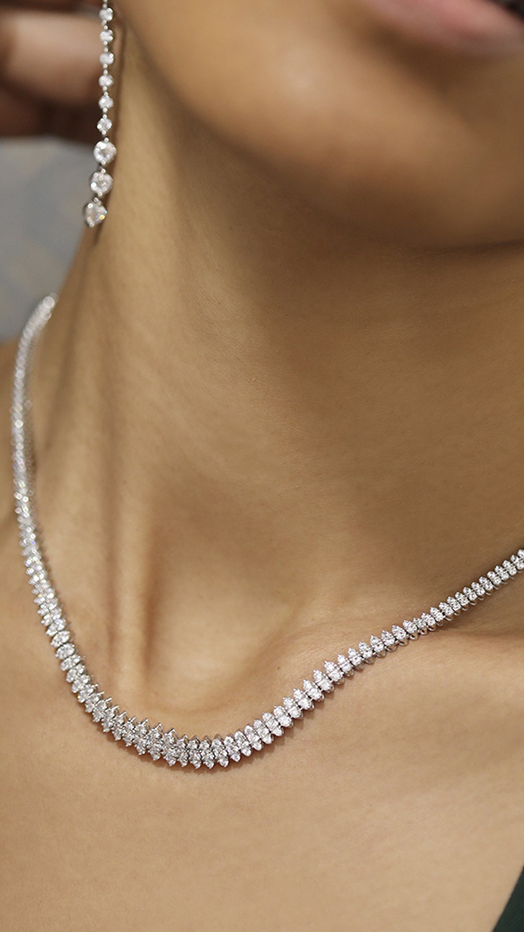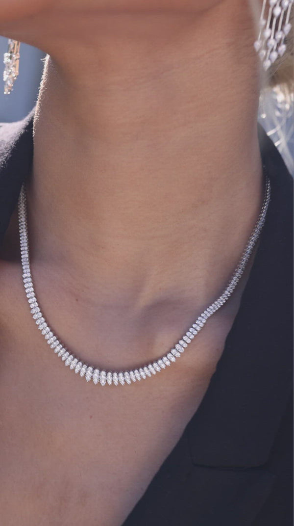 This stunning necklace, features our intricately cut Round Brilliant stones joined together to create the illusion of a Marquise Cut created gemstones. Wear it with the matching Estelle bracelet to complete this elegant look.