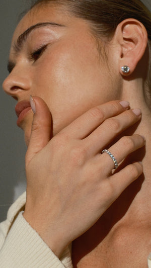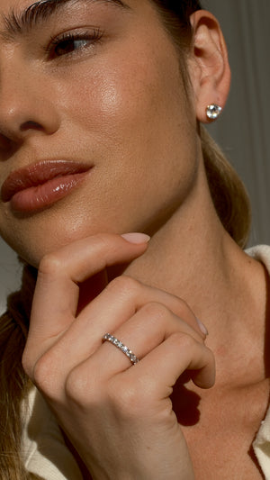 The Raina ring is a simple and elegant eternity band. Set in 9K white gold, featuring a row of our exquisitely cut and polished round stones to ensure the ultimate sparkle, perfect for an everyday ring.