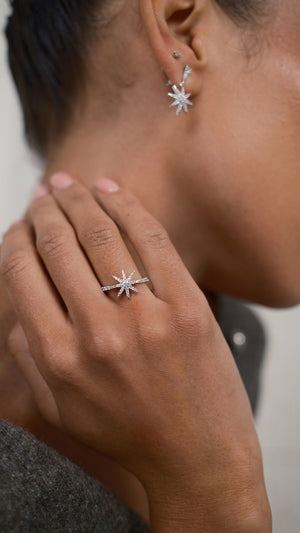 Inspired by bright starry nights and the magic of spontaneous adventures, this dainty White gold-plated ring is set in Sterling Silver with shimmering micro stones in Diamond White. Wear it with the other pieces from the collection.