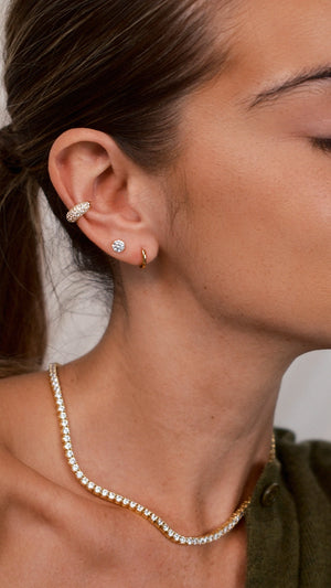 A yellow gold vermeil ear cuff with snow pavé detailing, the Hera ear cuff fits snugly and adds a little edge to any ear stack. Elegant and easy to stack with other ear cuffs, hoops and huggies to create your unique look.