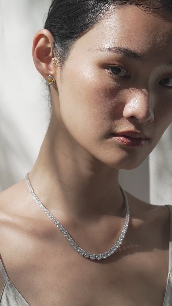 These classic studs feature an exquisite border halo setting with a stunning fancy yellow pear cut centre stone. Wear it as your everyday basic.