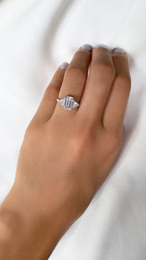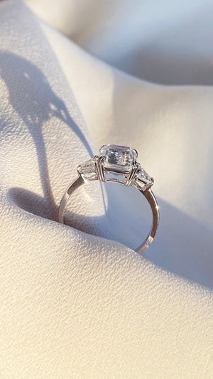 A classic style with an air of vintage inspiration, this stunning ring showcases a superbly cut and polished 3ct Emerald Cut central stone bordered by 2 TrillIon side stones to complete this magnificent piece. Eye-catching yet subtle enough for daily wear.