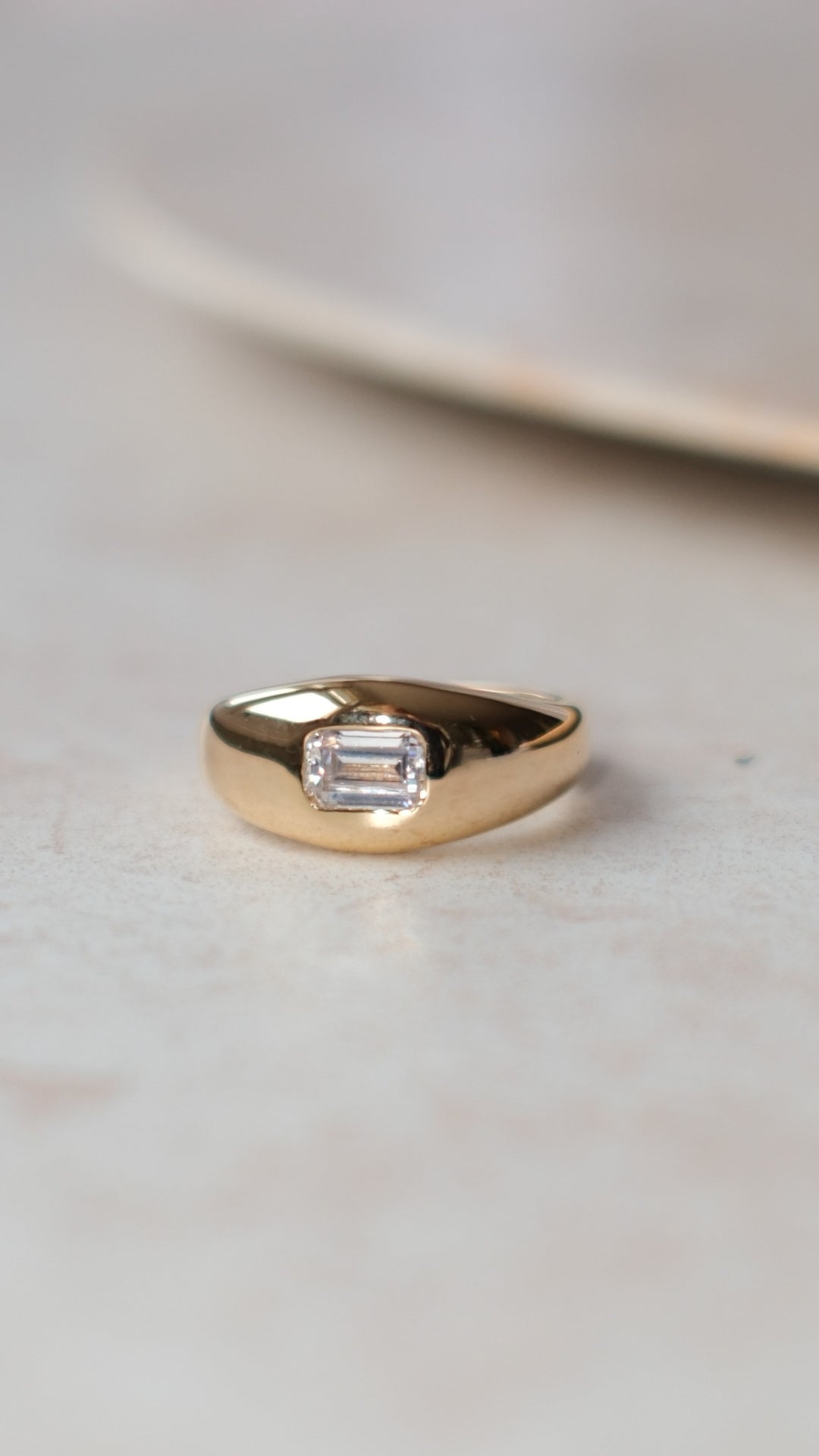 Sleek, smooth and seriously stylish this signet ring features an emerald cut gemstone set in an 18K yellow gold vermeil bezel for a minimalist look that still stands out.
