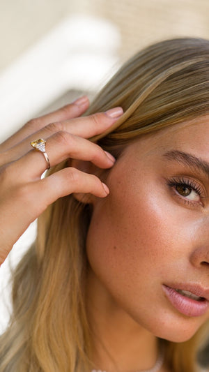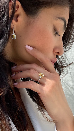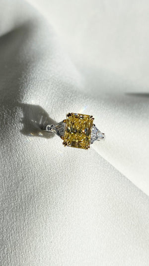 It's one of our favourite baby cocktail rings. This ring features a radiant-cut main stone and two Triangle cut shoulder stones.