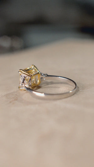 A baby cocktail ring showcasing a princess-cut light yellow stone in a classic trilogy design. Finished with a secure double prong two-tone gold setting rhodium plated and accented with side stones that catch the light.