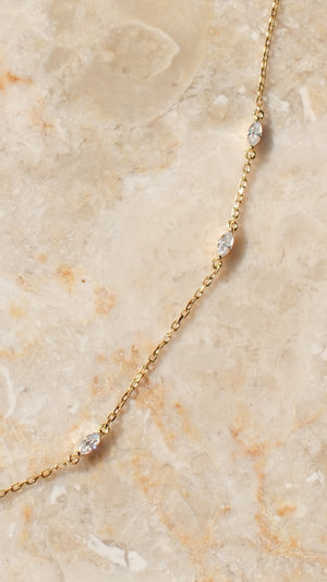 A simple marquis station necklace that easily layers with a simple pendant. Dress it up or down; this everyday necklace is a perfect starter for a layered look or worn on its own.