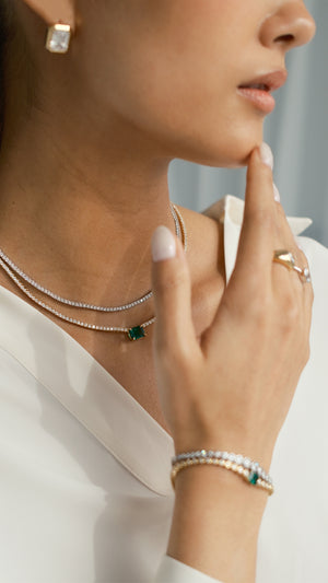 This tennis slider necklace features round brilliant-cut stones with a standout emerald centre that’s equal parts refined and playful.