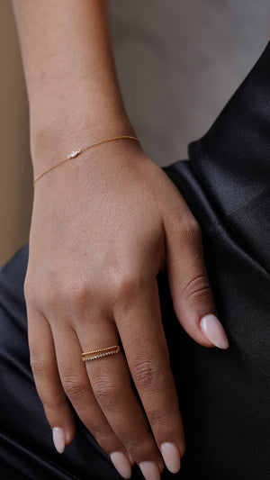 The Dixie bracelet features a single glittering diamond marquise set in a polished 9K yellow gold bezel setting. It sits on a delicate chain measuring approximately 16cm in length.