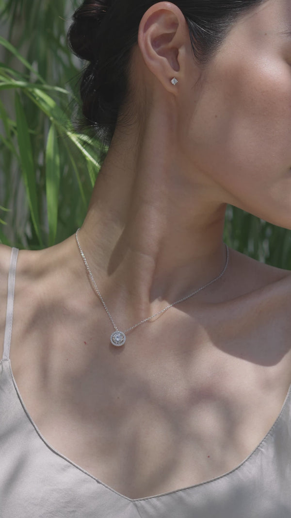 This staple pendant features a cute round brilliant in a clean halo setting. Suspended with a rolo chain, it's a reliable alternative everyday basic.