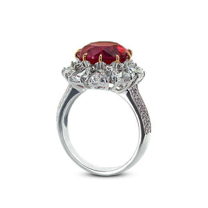 This feminine ring features a Round Brilliant ruby with a clustered in hearts and Round Brilliants. Slip on this beauty for an elegant evening touch.