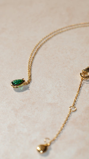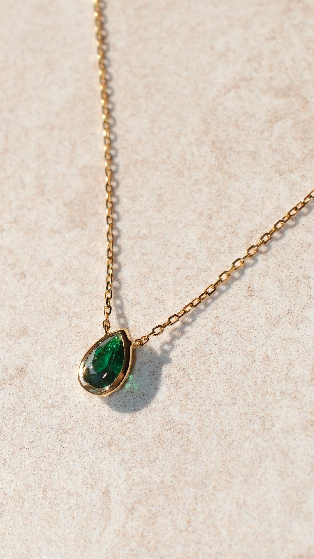 A cute, on-trend emerald-green bezel-set pendant. The open basket design allows light to pass through the setting, enhancing the deep emerald colours.