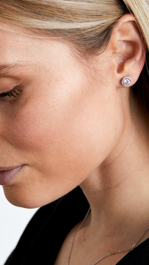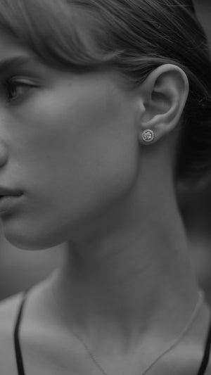 Our classic halo stud. It features a round brilliant-cut centre stone with a pave halo for maximum sparkle.