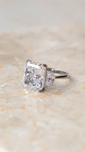 This spectacular cocktail ring is set with one of our premium radiant cuts and two half-moon cuts. Our radiant cut has the scissors-cut style crown and modified Barion-cut pavillion.