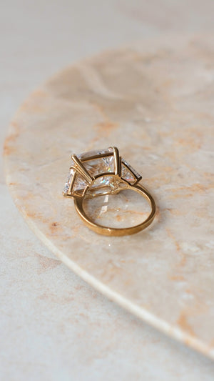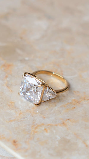 The timeless trilogy Gemma cocktail ring with one of our brilliantly cut Cushion centre stone. It is a stunning piece you will find yourself reaching for constantly. Wear this ring solo to uplift a casual edit or complement a look after hours.