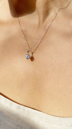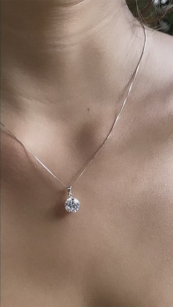 This stunning and simplistic four-prong pendant necklace has a feminine twist. This classic pendant is set in 9K White Gold with a round brilliant cut. Wear it to add a touch of sparkle to your everyday look.